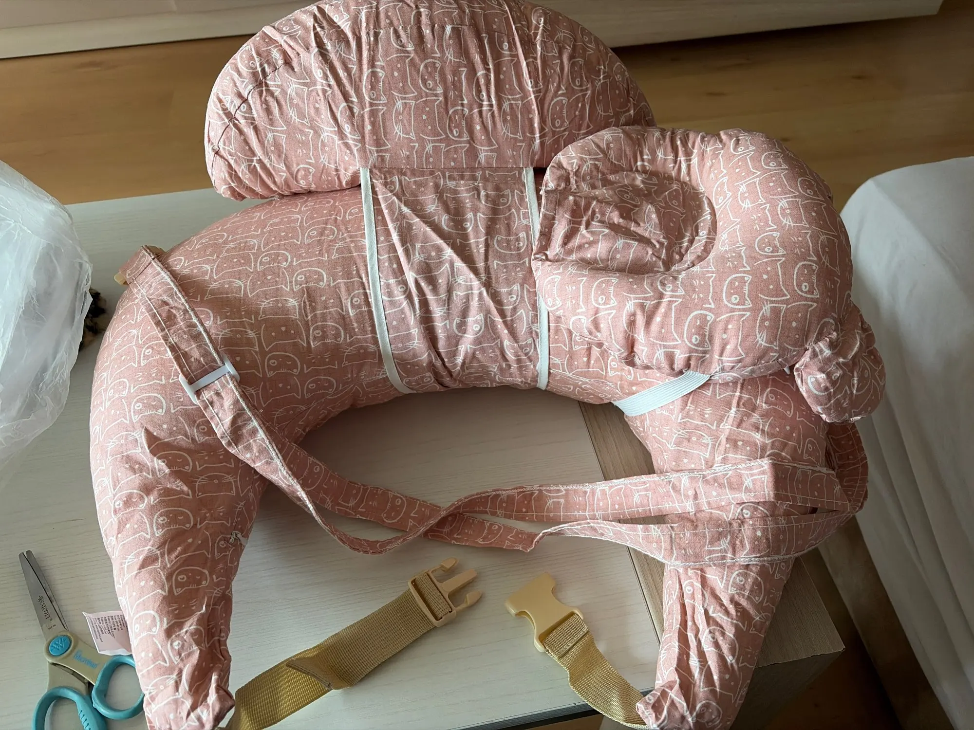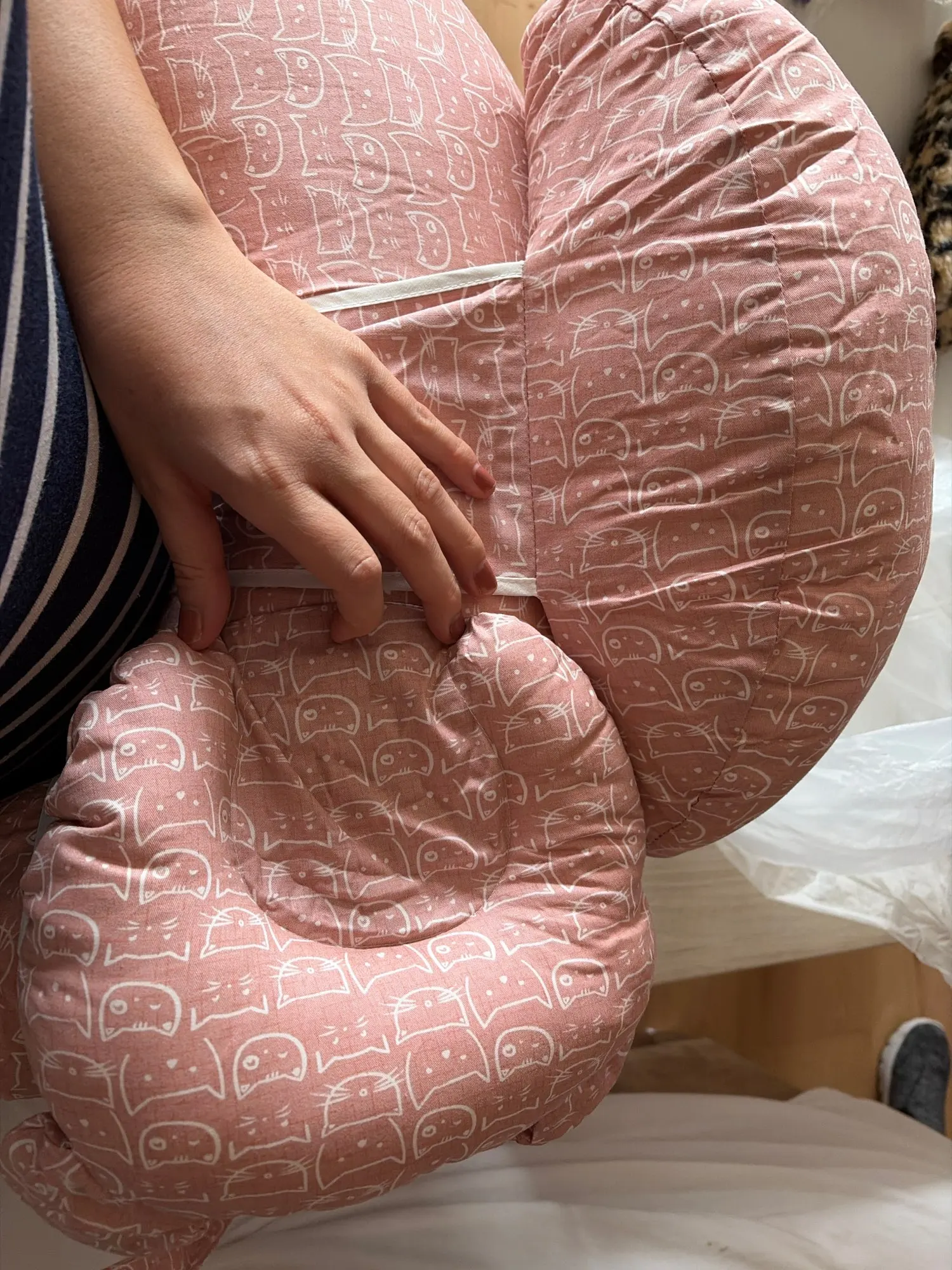 The pillow is designed with a compact and ergonomic shape, comfortably fitting around the mother’s waist and shoulders.
