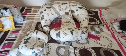 The pillow is designed with a compact and ergonomic shape, comfortably fitting around the mother’s waist and shoulders.